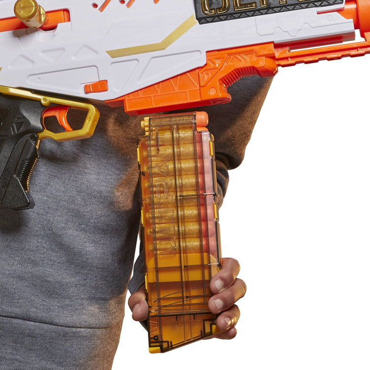 تفنگ نرف اولترا فرعون با تزئینات طلایی ممتاز: این تفنگ دارت نرف اولترا دارای تزئینات طلایی ویژه و دارتهای طلایی نسخه ویژه نرف اولترا است. تفنگ گلنگدنی نرف اولترا فرعون، گیره، دارت، محل نگهداری گیره، دوربین شامل یک گیره جداشدنی ۱۰ دارتی، قنداق مخصوص نگهداری گیره و دوربین یکپارچه. بلستر و گیره فقط با دارتهای Nerf Ultra کار میکنند. شامل ۱۰ دارت ویژه NERF ULTRA طلایی رنگ: رنگ طلایی ویژه، شکاف پروازی نوآورانه، فناوری Aerofin، فوم سبک Nerf Ultra. آنها فقط با بلسترهای Nerf Ultra کار میکنند...